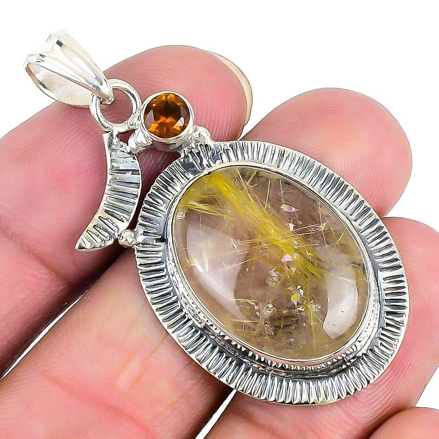 Golden Rutile Stone 925 Sterling Silver Bezel Sister Art Deco Pendant Jewelry