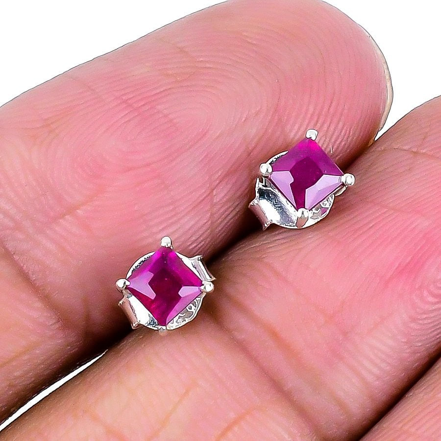 Kashmir Red Ruby Gemstone Unique Handmade Stud Post Sister Earrings Solid Silver