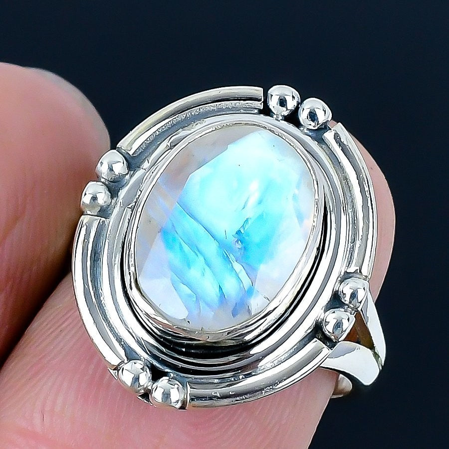 Rainbow Moonstone Faceted Gemstone Solid Silver Boho Statement Ring Jewelry US 7