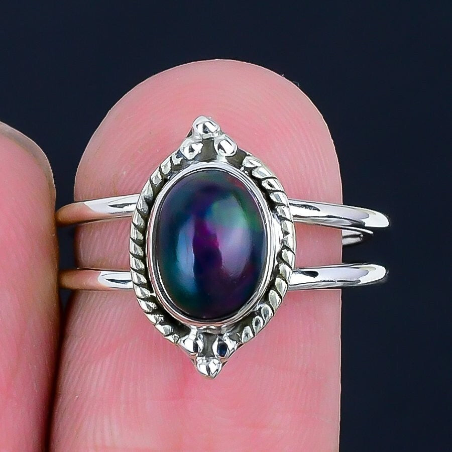 Black Ethiopian Opal Stone Cluster October Boho Ring Jewelry Size 7 Solid Silver
