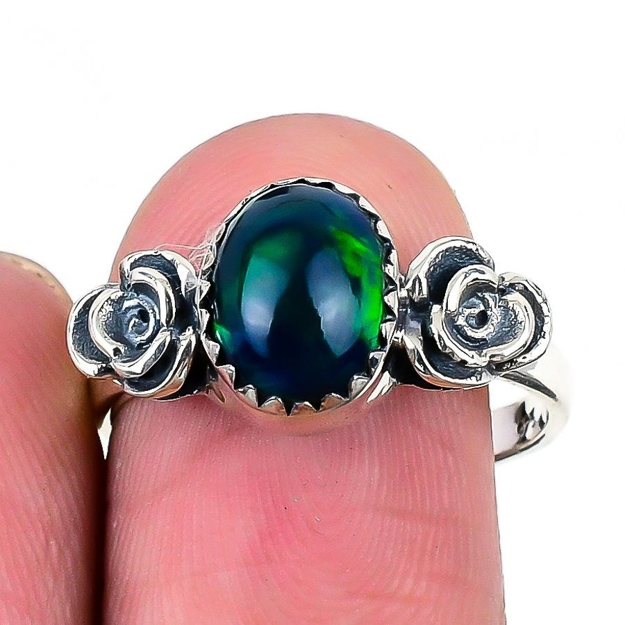 Black Ethiopian Opal Stone October Ethnic Statement Trendy Ring 925Ā SolidĀ Silver