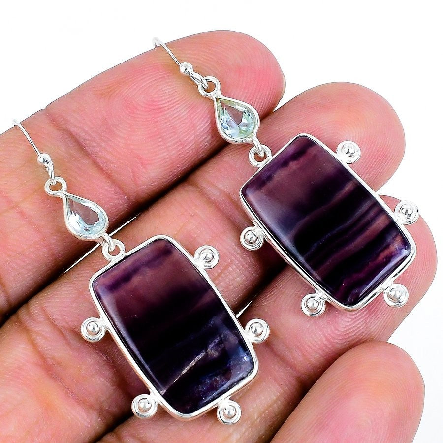 Natural Fluorite 925Ā SolidĀ Silver Bezel Dangling Birthday Hook Earrings Jewelry
