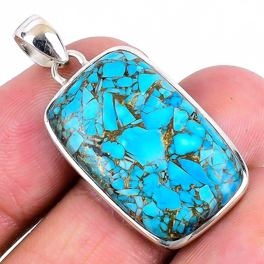 Copper Blue Turquoise Stone 925 Sterling Silver Bezel Sister Engagement Pendant