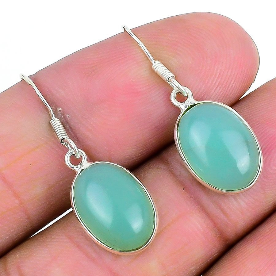 Natural Green Chalcedony Wife Wedding Dangle Hook Earrings 925 Sterling Silver