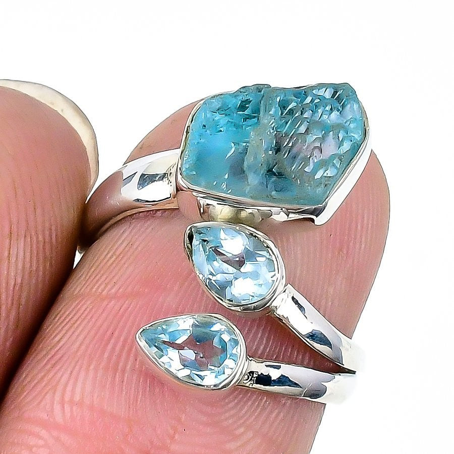 Natural Aquamarine Druzy Statement Sister Unique Ring Jewelry 925 Silver US 6.5