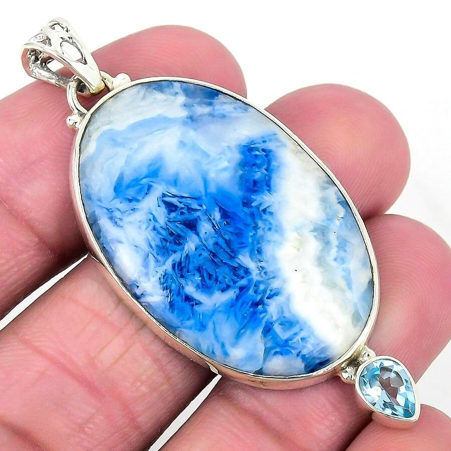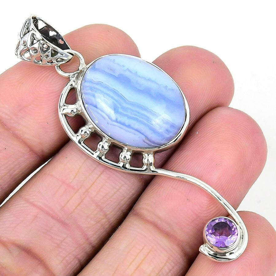 Blue Lace Agate Gemstone Solid Silver Channel Set Third Eye Chakra Boho Pendant