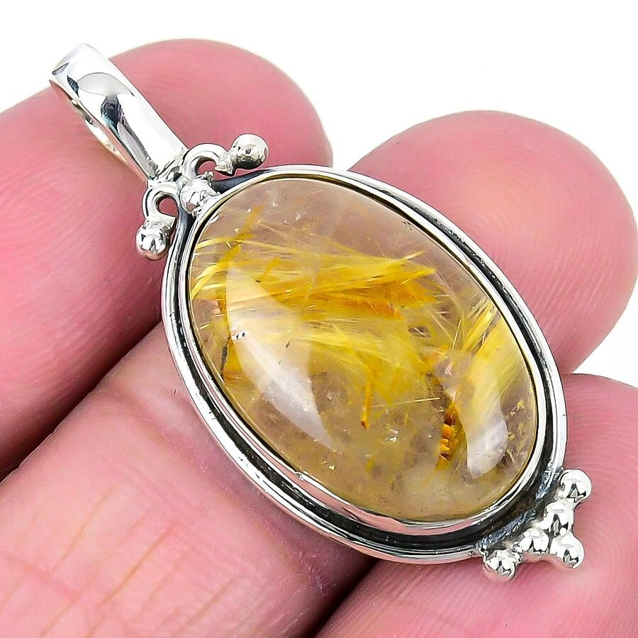 Golden Rutile Gemstone Solid Silver Artisan Channel Set Ethnic Elegant Pendant