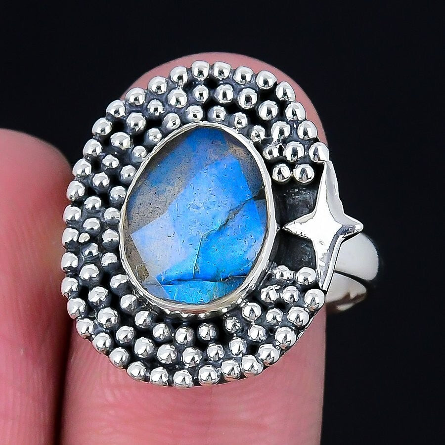 Labradorite Gemstone Birthday Cluster Channel Set Boho Ring Size 9 Solid Silver