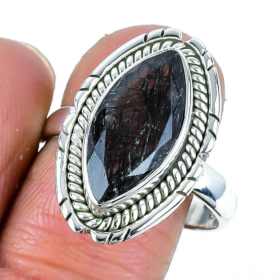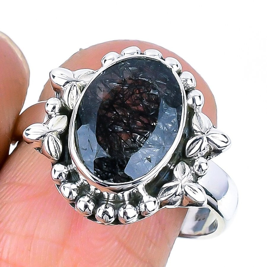 Natural Black Rutile Faceted Solid Silver Statement Wedding Ring Jewelry Size 10