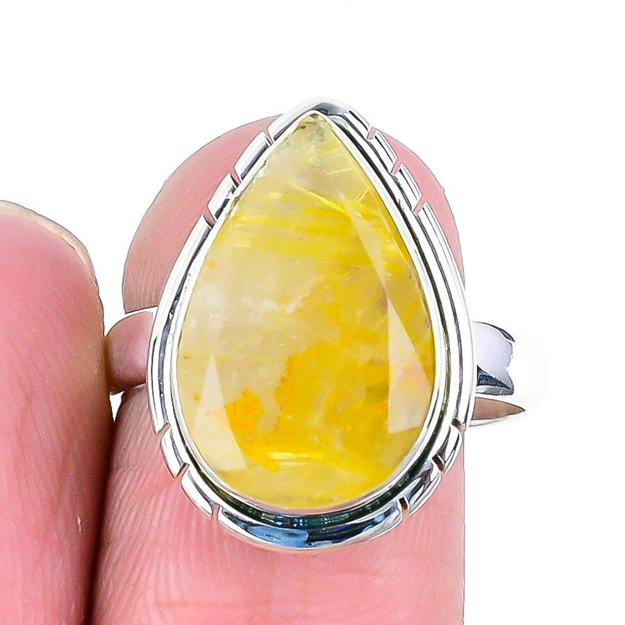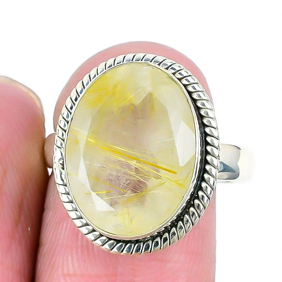 Golden Rutile Stone 925 Sterling Silver Birthday Cluster Artisan Ring Size 8.5