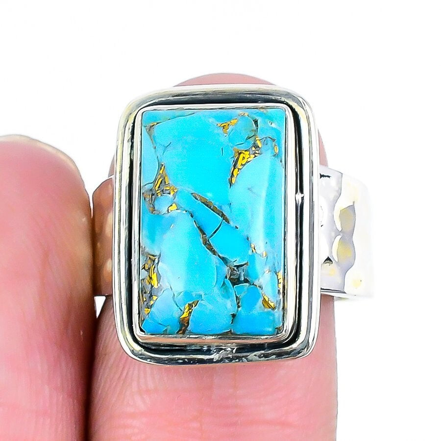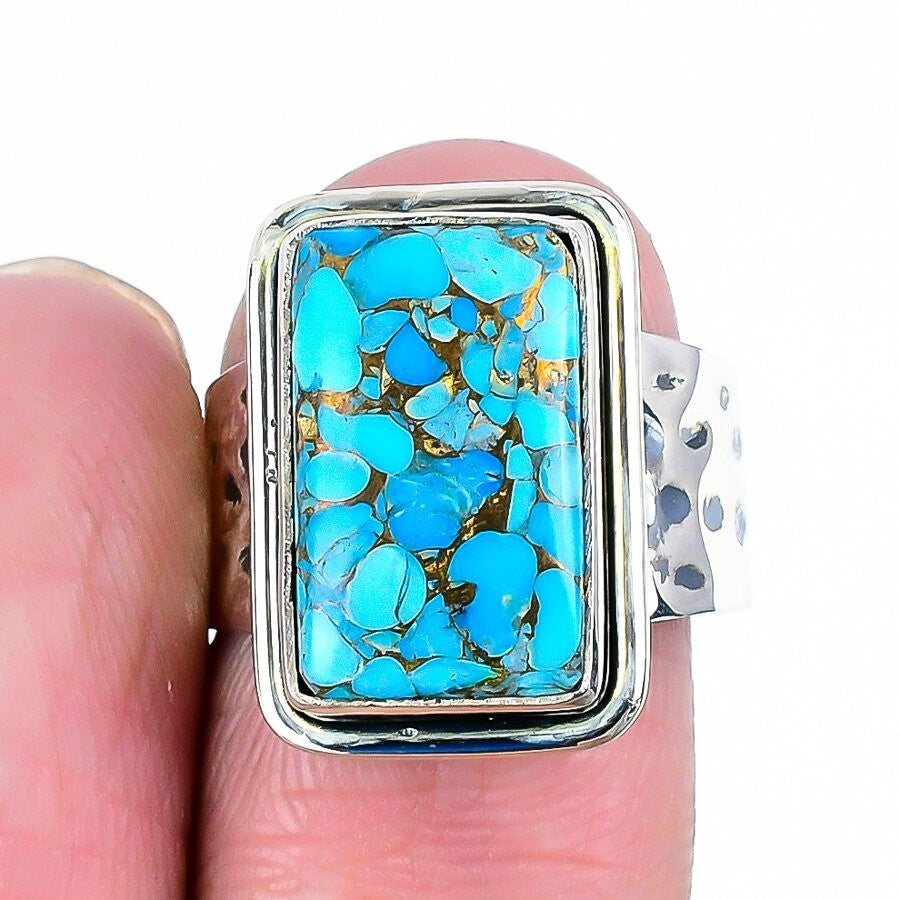 Copper Blue Turquoise Gemstone 925 Solid Silver Cluster Ring Jewelry Size 7.5