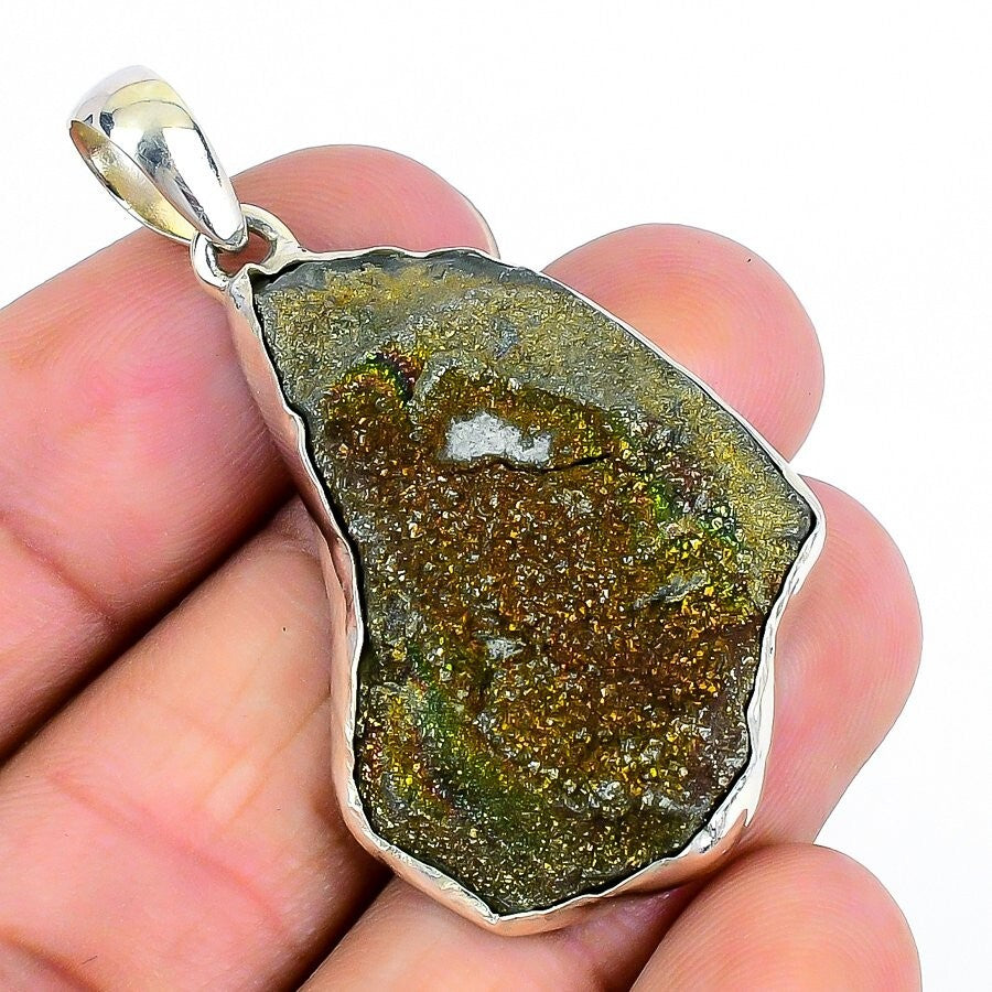 Natural Rainbow Pyrite Druzy Channel Set Sister Pendant Jewelry 925 Solid Silver